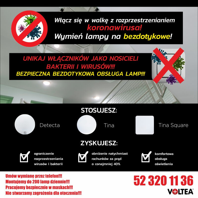 Włącz się zatem w ogólnopolską akcję walki z rozprzestrzenianiem się koronawirusa i wymień oprawy na BEZDOTYKOWE LED. Zyskasz większe poczucie bezpieczeństwa, ograniczysz namnażanie się wirusów i bakterii, zyskasz komfortową obsługę oświetlania oraz obniżysz rachunki za prąd.