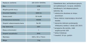Zastosowanie: Oświetlenie biur, sal konferencyjnych, sal wykładowych, recepcji, obiektów handlowych, hal ekspozycyjnych, salonów, sklepów, hoteli.